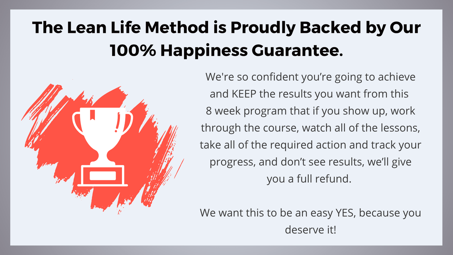 The Lean Life Method (LLM) is our signature online program that gives you a 8 week action plan with accountability and support to help you achieve your goals and give you the tools to sustain your results for life.